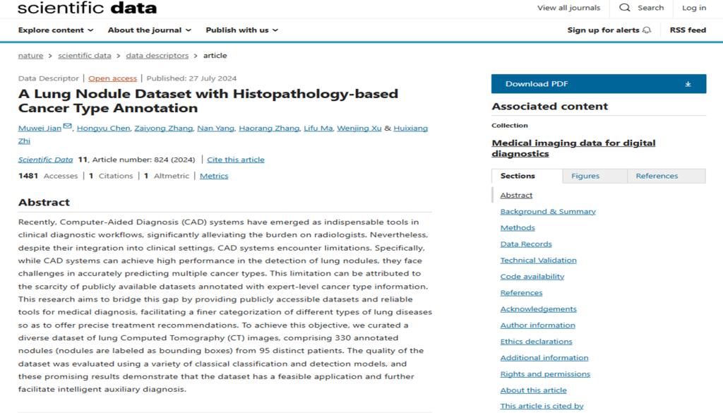 此外,蹇木伟教授牵头与临沂市中心医院合作完成的论文“A Lung Nodule Dataset with Histopathology-based Cancer Type Annotation”在Nature子刊《Scientific Data》上发表(卷号:11,期号:1,文章编号:824)。