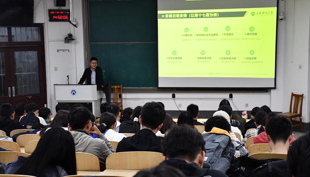 李建强从创新创业竞赛体系、双创竞赛备赛要点、“国创计划”申报要点、社会实践和成果转化、实践和竞赛保障体系5个方面向同学们作了精彩的报告。解读了中国高等教育学会和教育部等发布的全国普通高校大学生竞赛排行榜的竞赛项目名单,为同学们以后的备赛参赛指明了方向;重点就“挑战杯”系列竞赛、“互联网+”大赛和双创竞赛的概况、参赛资格、作品申报、团队组建、项目选题及学术论文和调查报告的撰写规范等方面分别进行了详细讲解。为同学们划出了各类赛事的备赛“要点、重点和亮点”,干货不断,充分体现了其多年的大赛组织和指导经验,同时和同学们分享了很多曾在“挑战杯”“互联网+”等大赛中屡获佳绩的优秀作品案例。