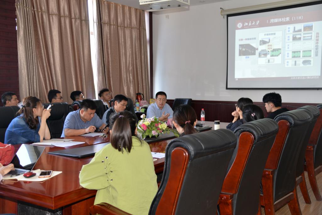 做了主题为《跨媒体智能:表征、分析与应用》的学术报告。会议开始由韩慧健院长介绍了彭教授的杰出学术成就并发表了欢迎致辞,表达了对彭教授的热烈欢迎。部分老师以及全体研究生参加了本次学术报告。彭宇新教授首先对中国工程院“人工智能2.0”中跨媒体分析推理技术的任务和目标进行了详细介绍,然后重点介绍其带领的北京大学团队最新相关研究进展,包括细粒度图像分类、跨媒体检索、文本生成图像、视频描述生成等。具体包括如何借鉴人脑的跨媒体特性,跨越视觉、听觉、语言等不同的感官信息认知外部世界,以及如何提高计算机的感知认知能力和智能水平等。整场报告观点新颖、内容丰富,在场的所有师生认真聆听了本次学术报告,对跨媒体智能的相关研究有了一个全新的认识,为之后的学术科研开拓了新的道路和方向。最后彭宇新教授与在座的老师同学进行了交流讨论,仔细地解答了师生们提问的问题,充分达到了开展此次学术报告的目的。