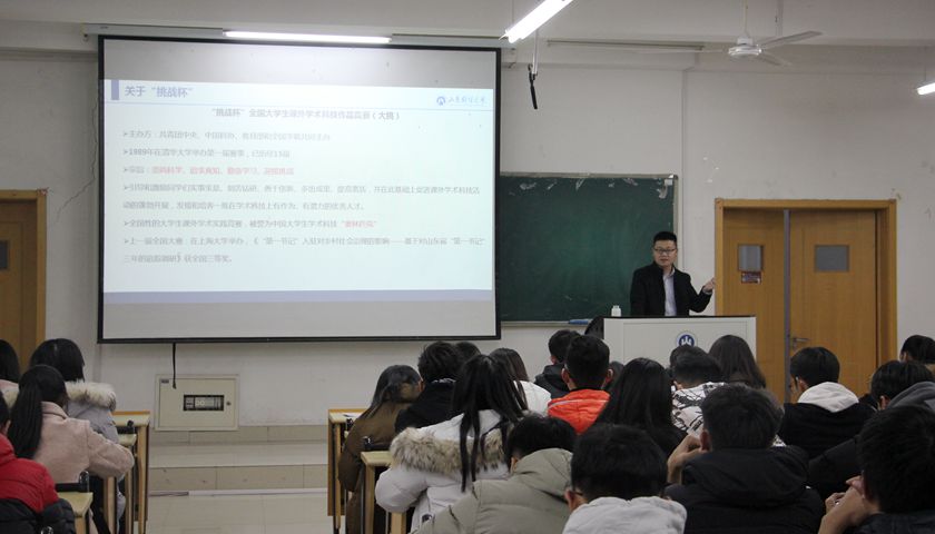 李建强就“挑战杯”系列竞赛概况、参赛资格、作品申报、团队组建、项目选题及学术论文和调查报告的撰写规范等方面分别进行了详细讲解。他介绍了“挑战杯”竞赛的发展史、国内影响以及我校近年来的参赛情况正如挑战杯其名,挑战杯竞赛既是对学生又是对指导老师包括专业水平、团队合作、协调资源、长期耐力等在内的多方面挑战。