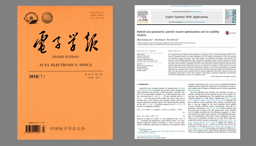 刘兆广副教授以第一作者身份分别在我校特类期刊《Expert Systems With Applications》上发表论文《Hybrid non-parametric particle swarm optimization and its stability analysis》,在A类期刊《电子学报》上发表论文《一种快速收敛的非参数粒子群优化算法及其收敛性分析》。主要研究成果如下: