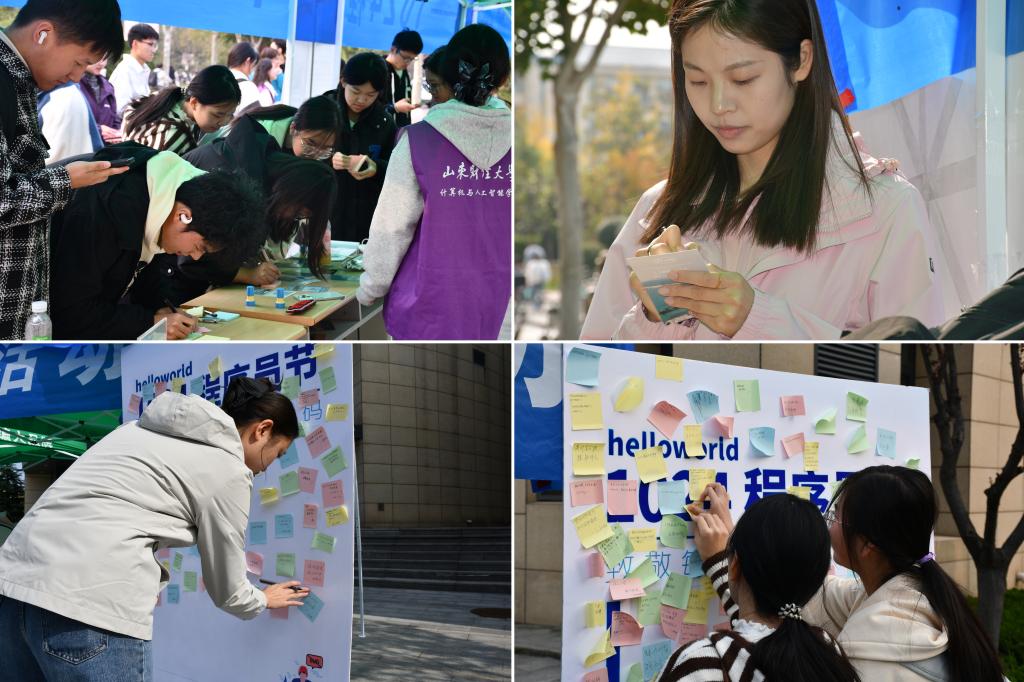 在志愿者的引导下,同学们纷纷在涂鸦板上写下自己学会的第一个代码,其中经典的“hello world”勾起了多数人的回忆,还有很多同学写下了自己对未来或者学校的美好祝愿,大家满怀兴致参与其中,涂鸦板上很快便贴满了便签,鲜艳的色彩和美好的字句吸引同学们驻足欣赏。