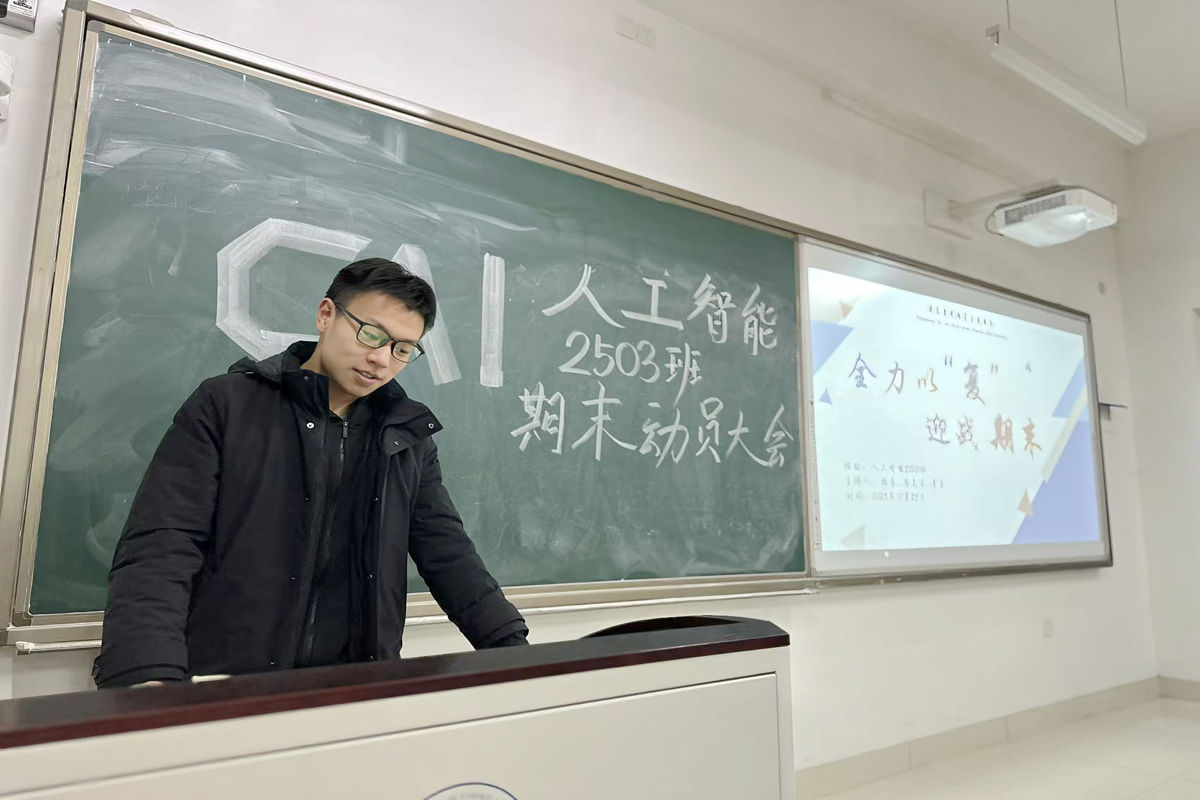 人工智能专业2503班与2504班联合召开期末考试动员主题班会。班会由2503班班长武平主持,两班全体同学共同参与。