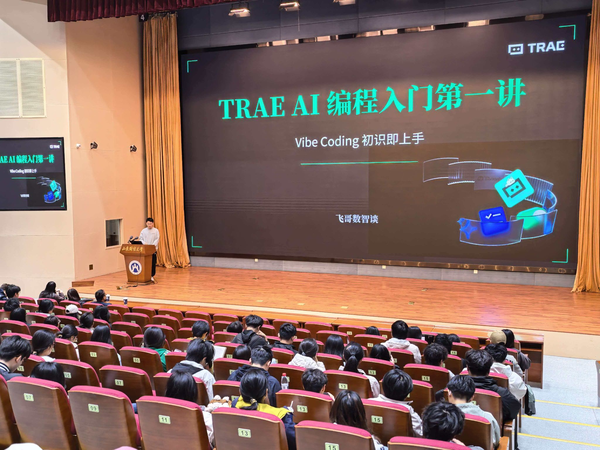 4月9日,主题为“财智校园,AI同行”编程黑客松系列赛前培训首场讲座在章丘校区图书馆报告厅举行,字节跳动AI原生编程IDE——TRAE团队带来“Vibe Coding初识即上手”主题分享,特邀嘉宾TRAE Friends@济南 Fellow、AI·Spring社群发起人董鹏飞担任主讲,swag视频