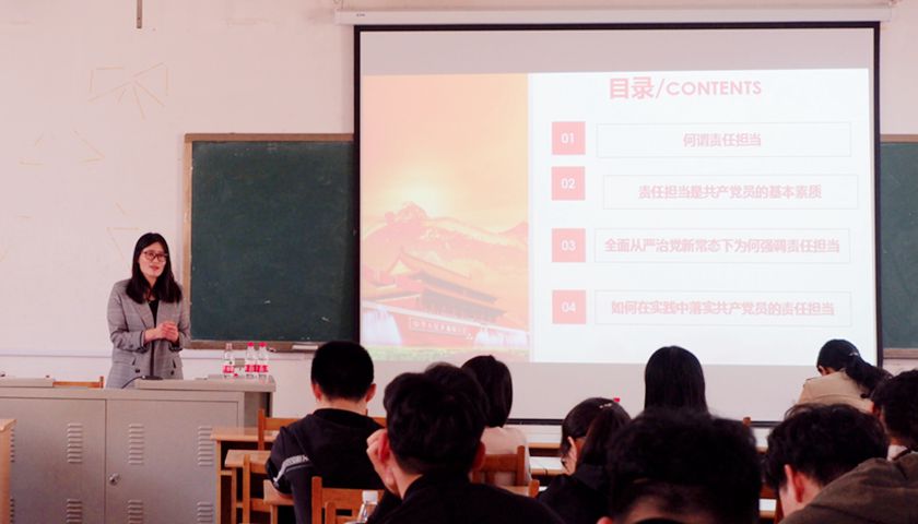党课上,付冷冷首先用她十几年的工作经验、人生阅历,阐释了何谓“信仰”、何谓“底线思维”,并由此引入党课主题。党课主要包括何谓“责任担当”、责任担当是共产党员的基本素质、全面从严治党新常态下为何强调责任担当、如何在实践中落实共产党员的责任担当四个部分。她强调共产党员要有作为,要多贡献,要忠诚、干净、担当,在落实责任担当时,要坚定的践行八个字——坚持原则、认真负责。傅冷冷结合教师工作和学生学习情况带领大家不断发问:我有责任感吗?我的责任感体现在哪些方面?我做得够好吗?我怎么可以做得更好?引导大家积极思考。她还带领大家回顾了历代共产党人是如何有责任有担当的。